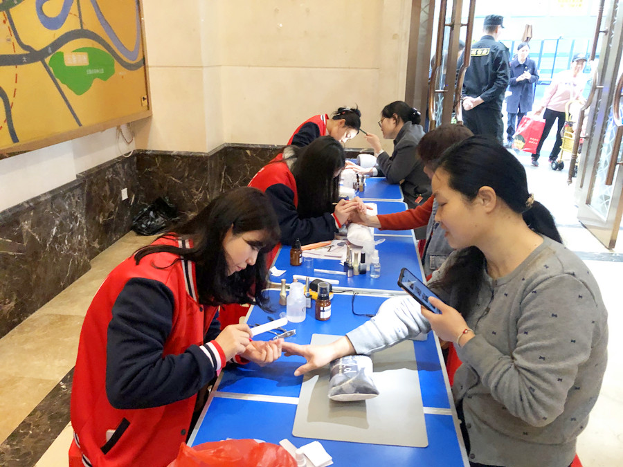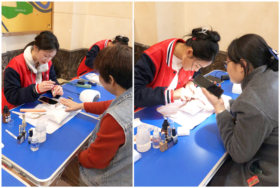 活動(dòng)當(dāng)天,同學(xué)們雖然只為居民提供了簡單的修手,修剪死皮,打磨甲型,甲面護(hù)理以及進(jìn)行單色涂抹,但大家并沒有因此就變得怠慢。面對居民的需求,大家細(xì)心對待,用專 業(yè)技術(shù)去服務(wù)每一個(gè)居民,讓她們感受美甲技術(shù)的魅力。