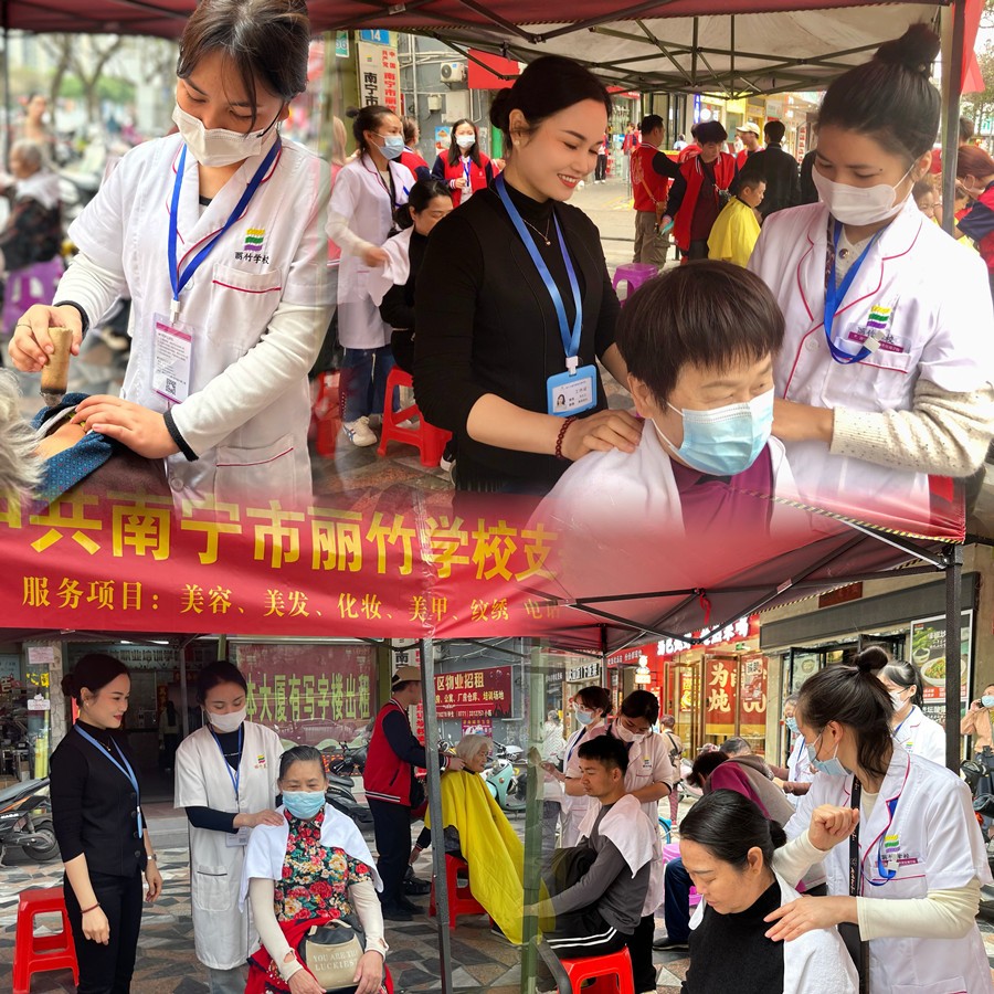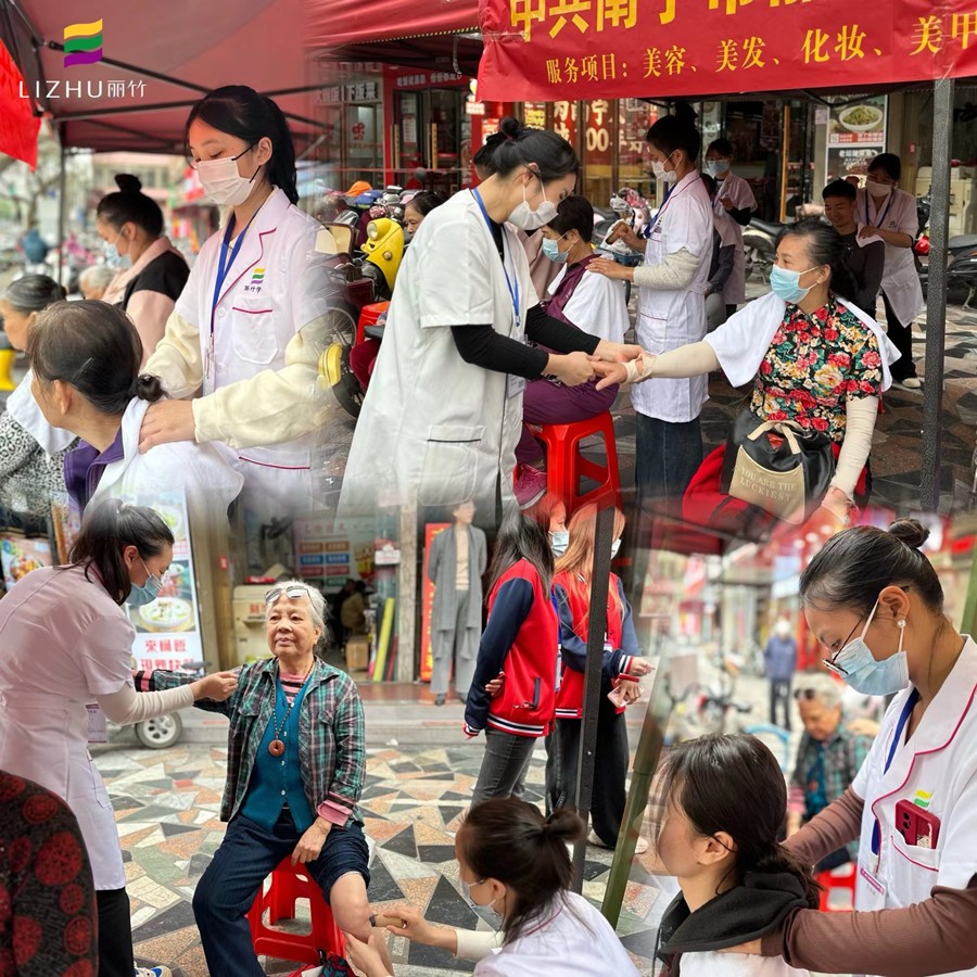 南寧美容公益活動、南寧美容培訓外出教學:踩著三月的尾巴,南寧美容職業(yè)技師學校-南寧美容培訓班(麗竹美容培訓班)的同學們直接在校門口擺起了臨時“艾灸館”,免費為居民提供艾灸和按 摩等服務(wù)。阿姨體驗完后,都紛紛向同學們豎起了大拇指,感謝大家提供給的服務(wù),同學們也露出了燦爛的笑容給予答謝。