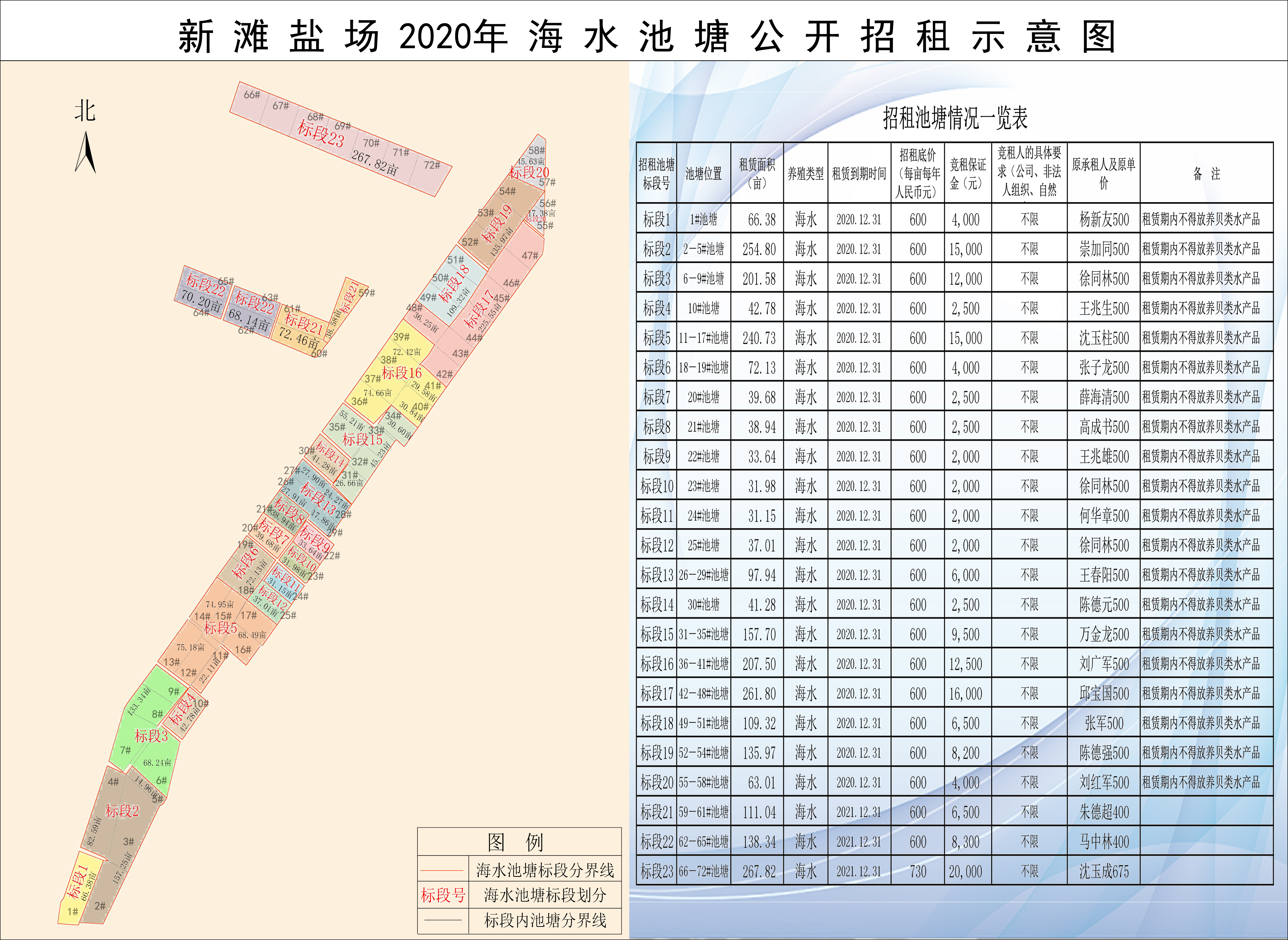 2.實(shí)行“一塘一價(jià)”,競(jìng)租人按照《招租池塘情況一覽表》中各個(gè)標(biāo)段號(hào)的招租池塘的招租底價(jià)、租賃期限、競(jìng)租保證金數(shù)額和對(duì)競(jìng)租人條件的具體要求等情況進(jìn)行報(bào)名競(jìng)租。